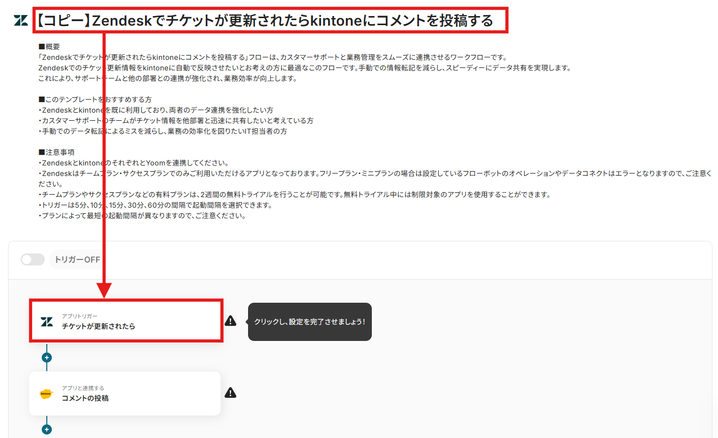 こちらは今回ご紹介したテンプレートとは反対に、Zendeskのチケットにkintoneで更新されたデータを追加するフローです。