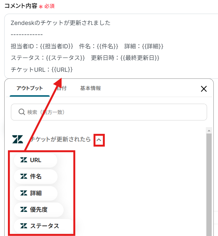 続いて、Zendeskで更新されたチケット情報をkintoneのコメントに追加する設定を行うため、「コメントの投稿」をクリックします。