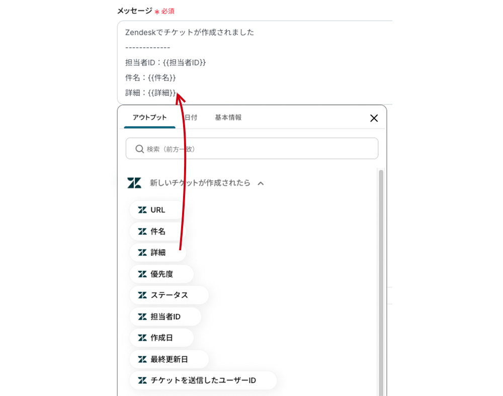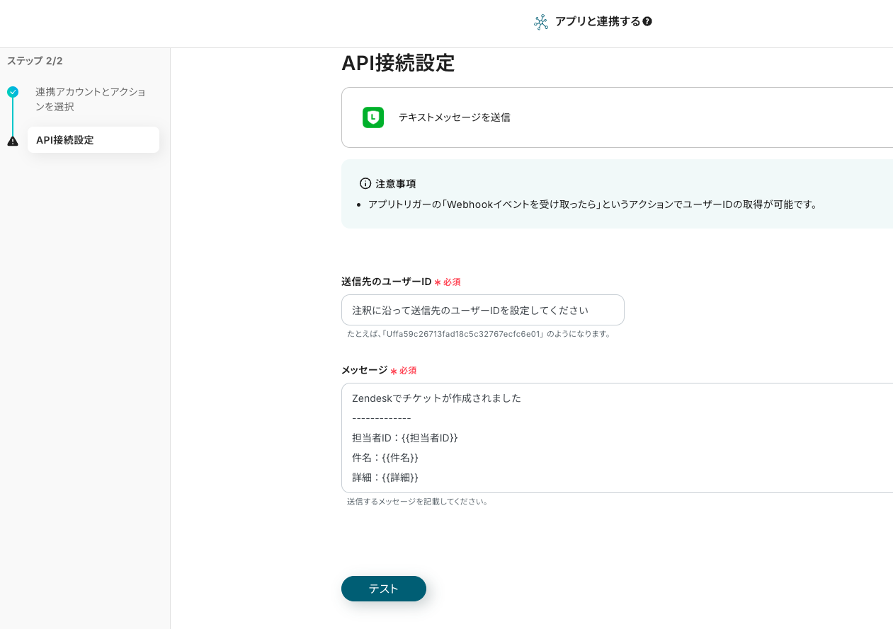 - LINEのオペレーション設定では、通知を送信したい先のユーザーIDと、送信するメッセージ内容を任意で設定してください。メッセージには、ZendeskのチケットIDや件名といった動的な情報を含めることが可能です。