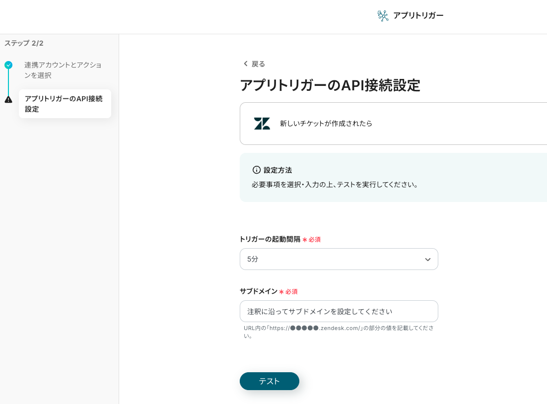- Zendeskをトリガーとして設定する際に、お使いのZendeskアカウントのサブドメインを任意で設定してください。