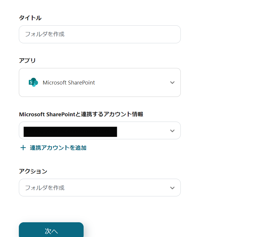 7)アクションは「フォルダを作成」を選択して、「次へ」をクリックします。