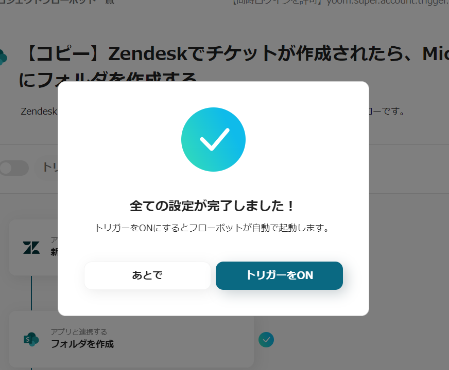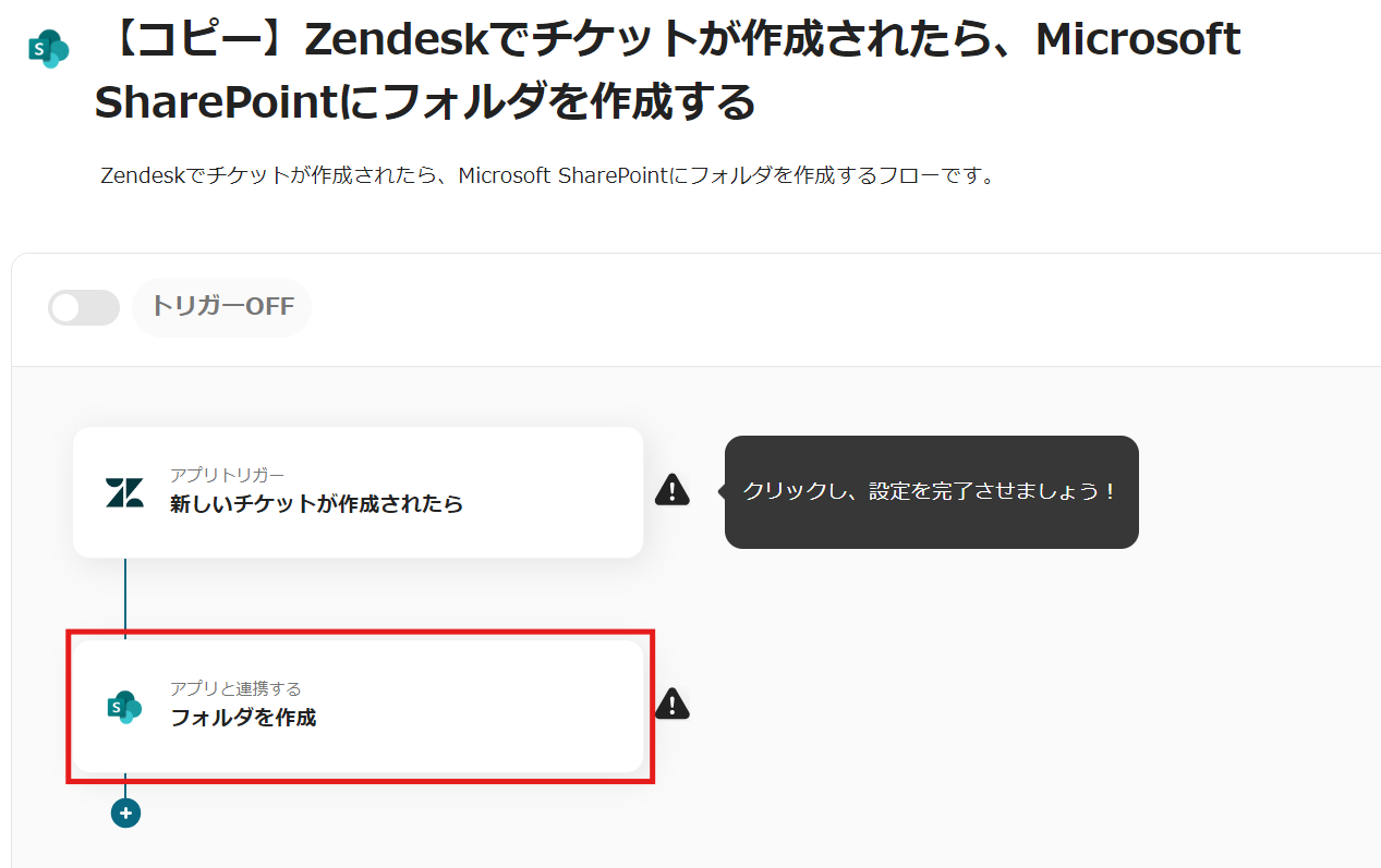 9)これで【Zendeskでチケットが作成されたら、Microsoft SharePointにフォルダを作成する】というフローの完成です。