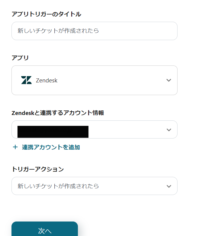 4)アクションは「新しいチケットが作成されたら」を選択して、「次へ」をクリックします。