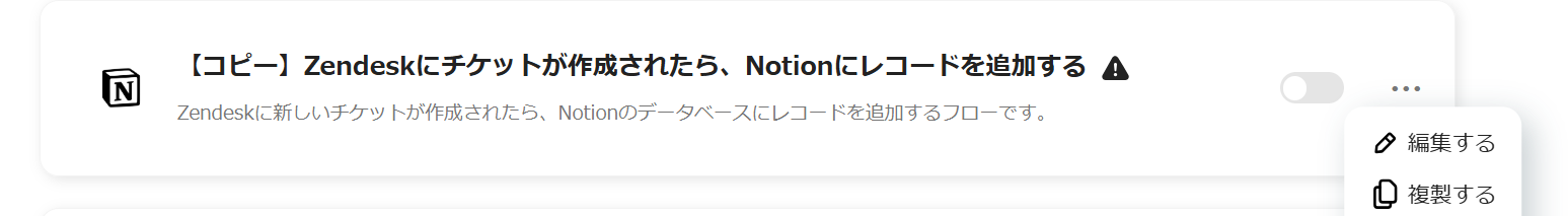 - トリガーボタンをONにして、ZendeskとNotionの連携フローの動作確認をする。