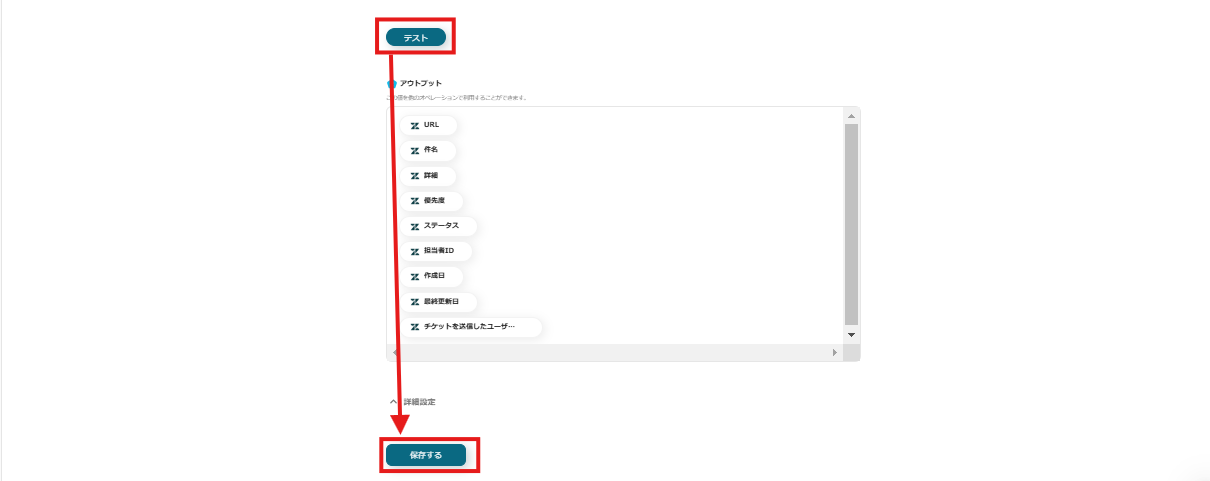 テストをクリックすると、先ほどZendeskに作成したチケットの情報がアウトプットに表示されます。