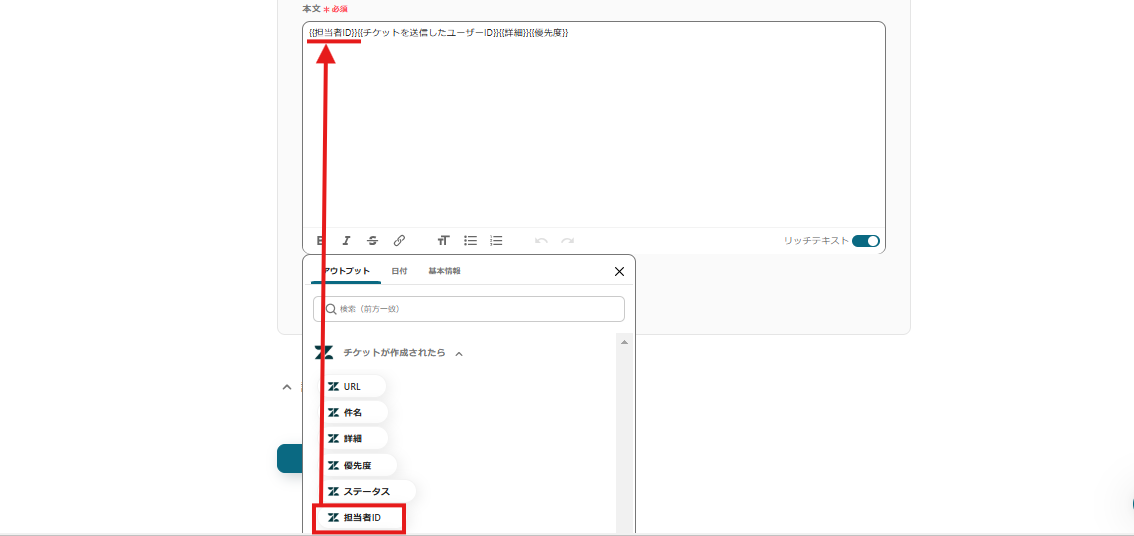 本文は、Zendeskのチケットの「担当者ID」「チケットを送信したユーザーID」「詳細」「優先度」を自動で取得できるように設定されています。