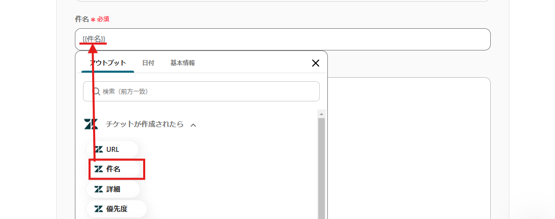 解説:このように設定することで、Zendeskにチケットが作成されたら、自動で「件名」を取得し、Outlookの件名に引用することができます。