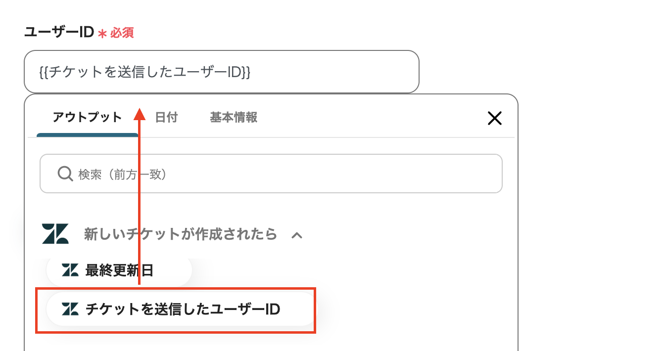 「ユーザーID」で入力バーをクリックすると、前ステップから取得したアウトプットを引用できます。