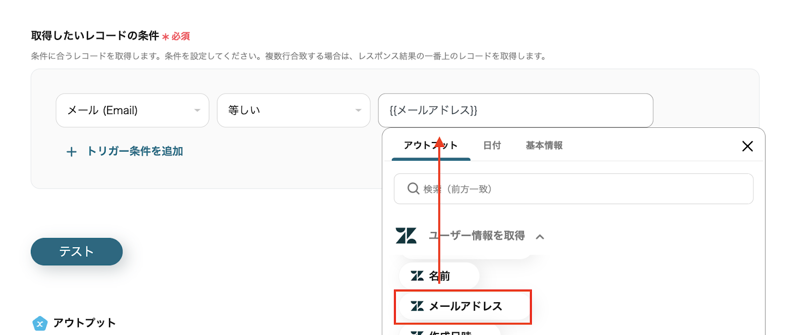 (以下は例として、取得したいレコードの条件として『メール (Email)』を指定し、条件を『等しい』、条件と一致する情報を『メールアドレス』(アウトプット活用)と設定したものです。)