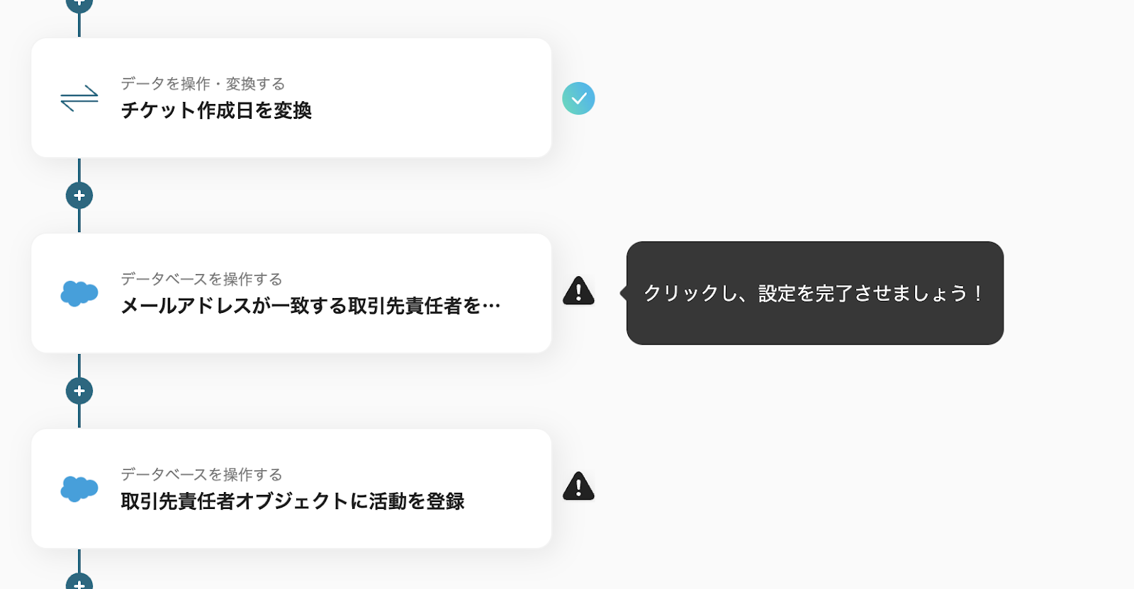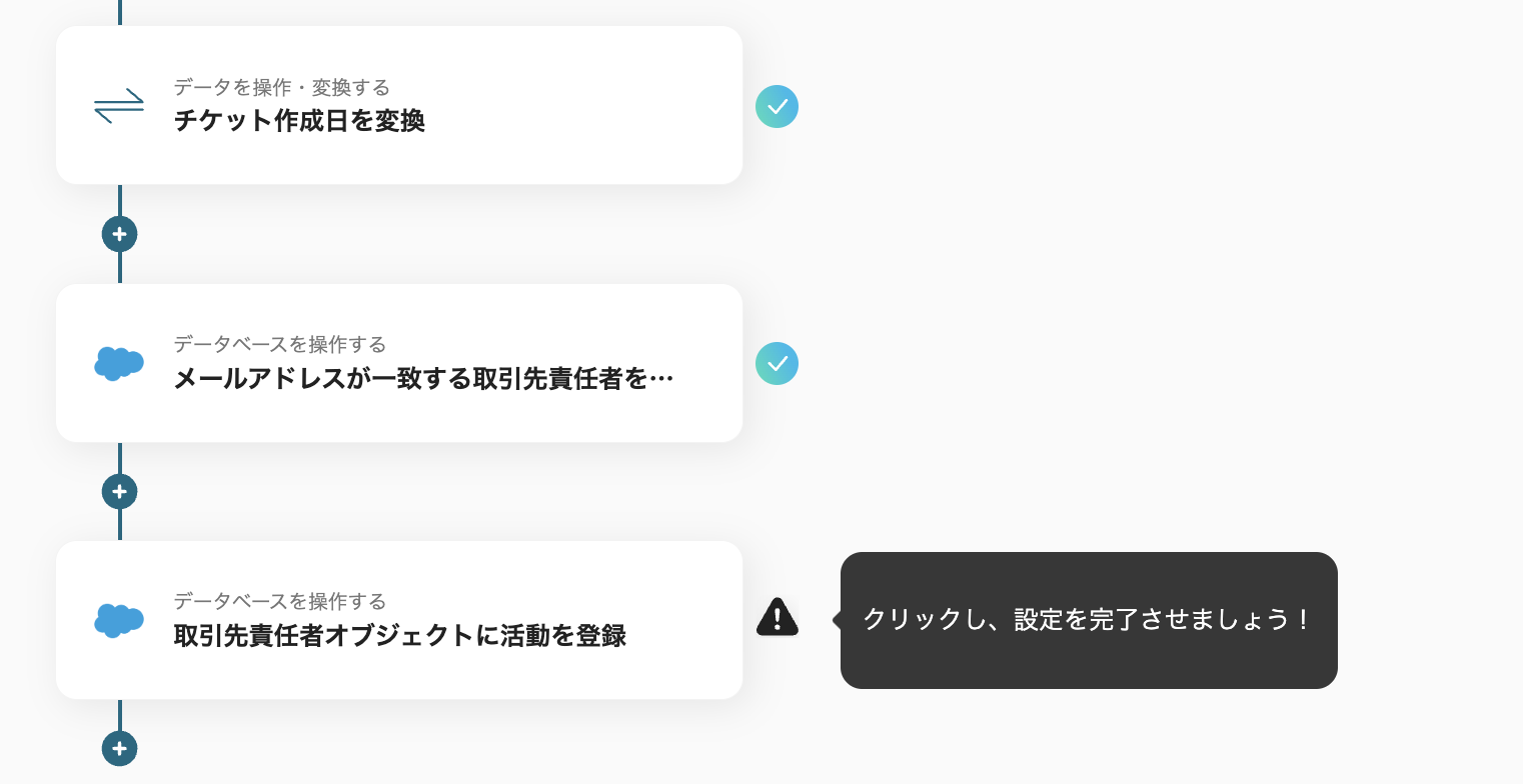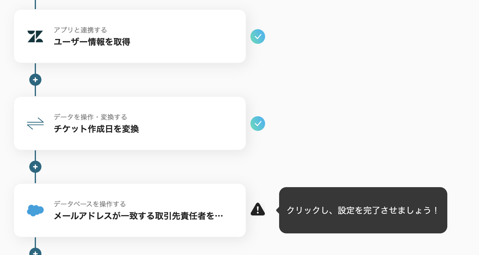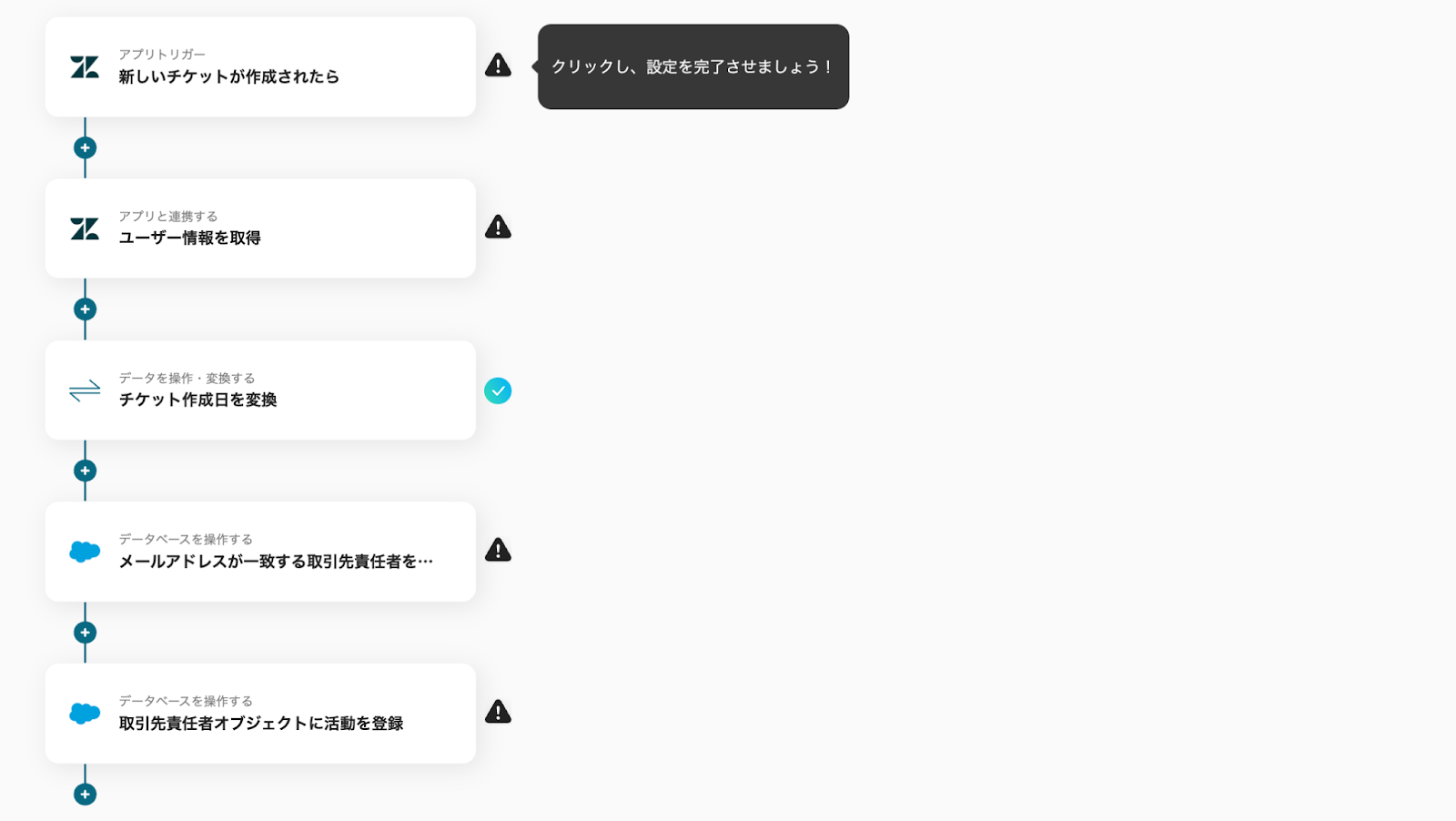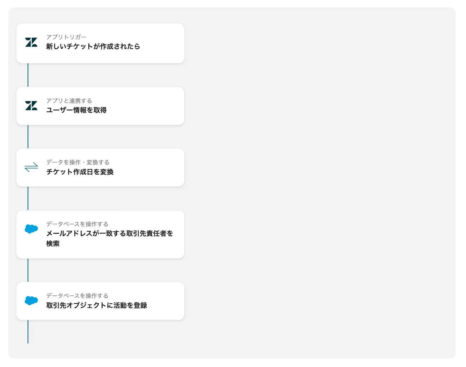 (2)このフローでは、Zendeskのチケット情報をSalesforceに反映する際、アプリの仕様に沿ったデータに置き換える必要があります。