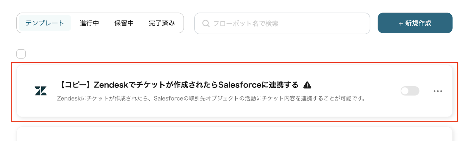 では、「Zendeskでチケットが作成されたらSalesforceに連携する」のテンプレートを使ったフローボットを作成していきましょう。