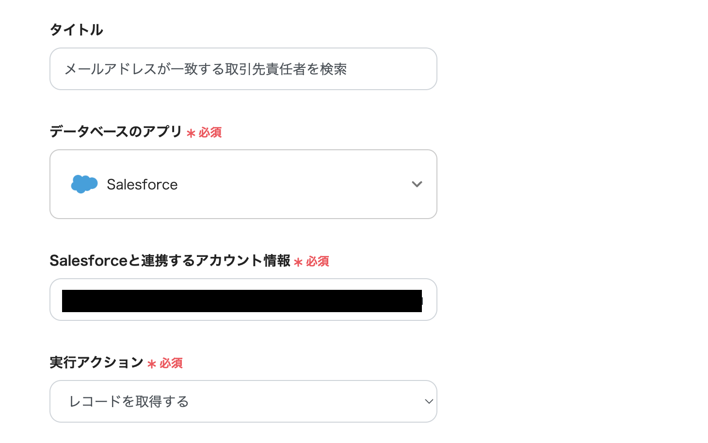 (3)次の画面では、Salesforceの指定したテーブルから条件に合うレコードを1行取得する設定を行います。