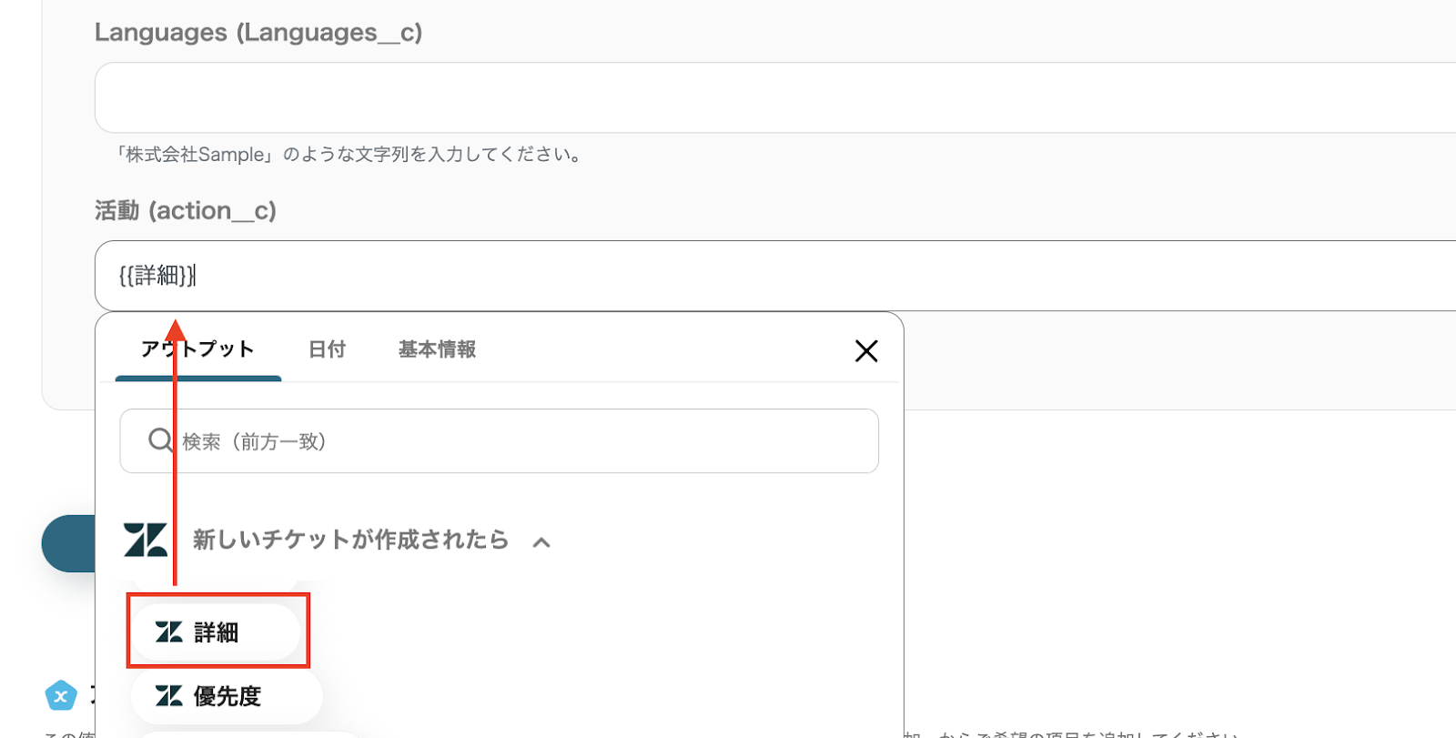 以下の画面のように、取得したアウトプット【作成日】を引用し設定を行います。