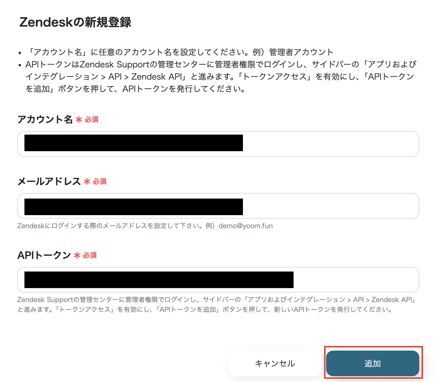 (3)「アカウント名」と「メールアドレス」、「APIトークン」を入力し、[追加]をクリックします。