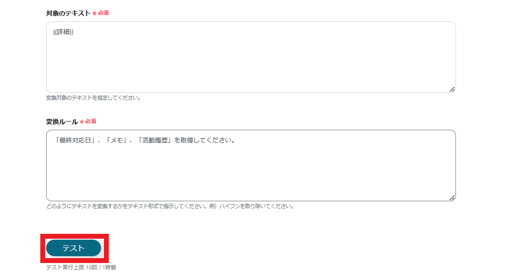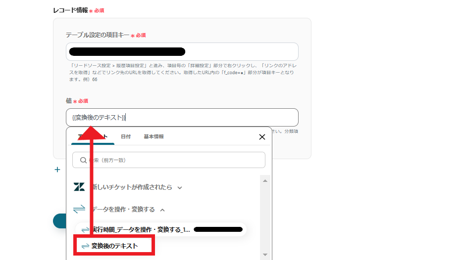 AIで抽出したデータを挿入したい場合は、以下のように「データを操作・変換する」から「変換後」のテキストを選択すると、先ほどAIで抽出したデータを挿入する形となります。