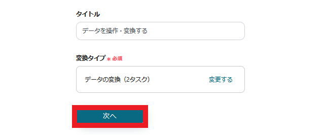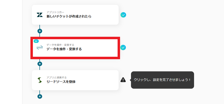 2.今回は、Zendeskで作成されたチケットからAIで最終対応日やメモを取得するというオペレーションを行うので、変換タイプは「データの変換」を選択します。