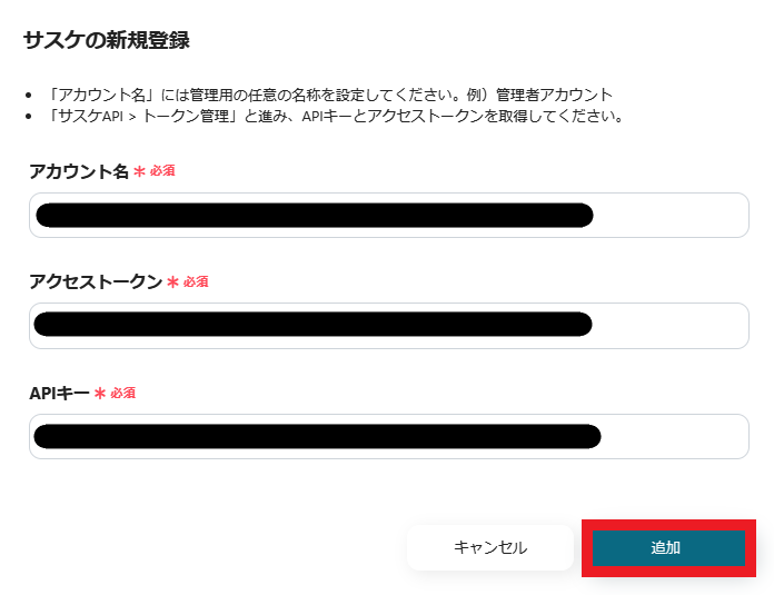 1.アカウント名、アクセストークン、APIキーを入力してください。