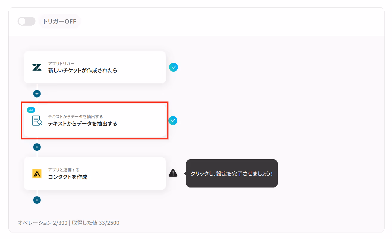 アクション選択画面に戻り、「全ての設定が完了しました!」と表示されていればフローの設定は完了です。早速フローを稼働させるのであれば、「トリガーをON」をクリックします。