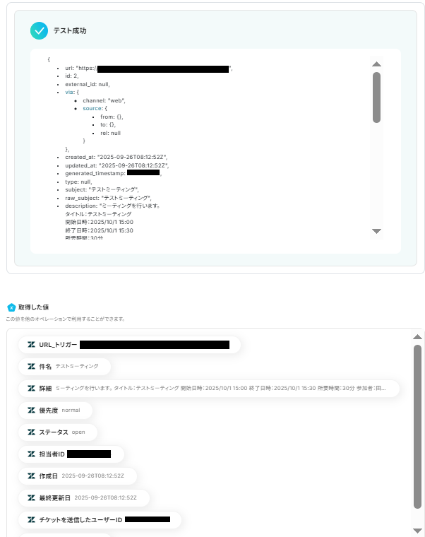 「テスト成功」の文字とリクエスト内容がJSON PATHで表記され、共に「取得した値」として、Zendeskに作成したチケットの内容が反映されていれば成功です!