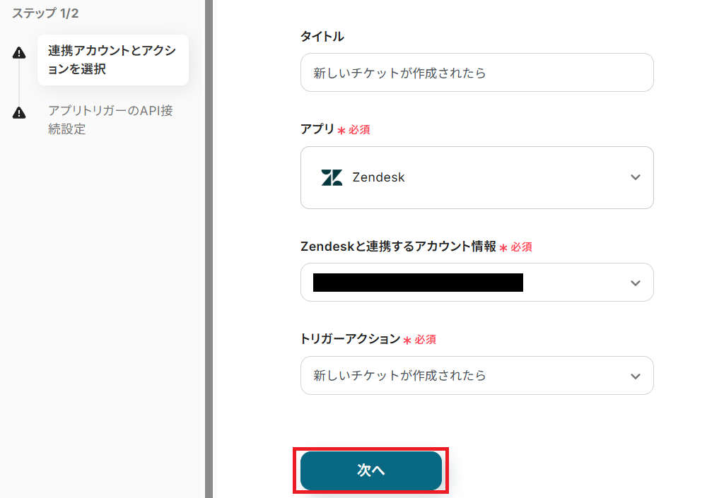 タイトルを任意で設定し、Zendeskと連携するアカウントやアクション内容を確認したら「次へ」を押してください。