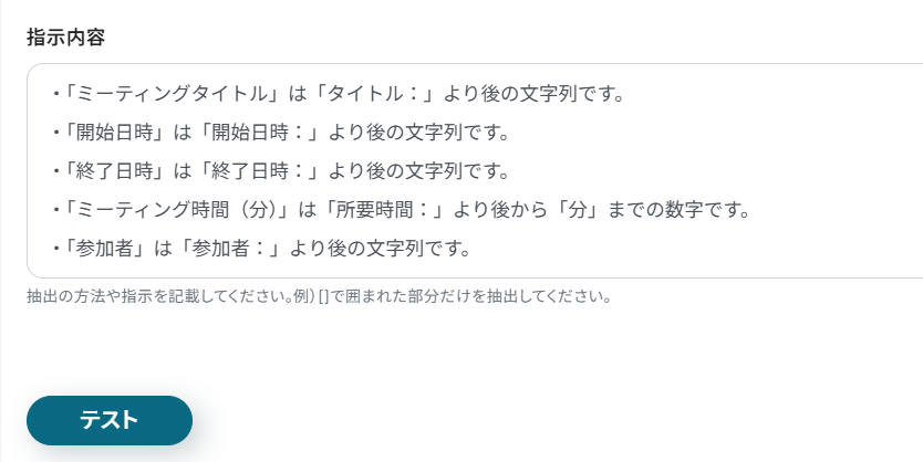 抽出したい項目を設定できたら各項目をどのようなルールで抽出するのか、AIに分かりやすいような指示を入力します。