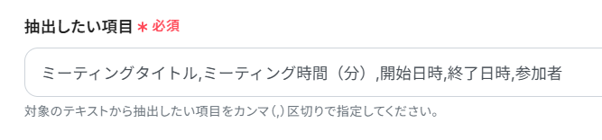 次に、対象のテキストから抽出したい項目をカンマ区切りで手入力してください。ここでは以下のように入力しました。