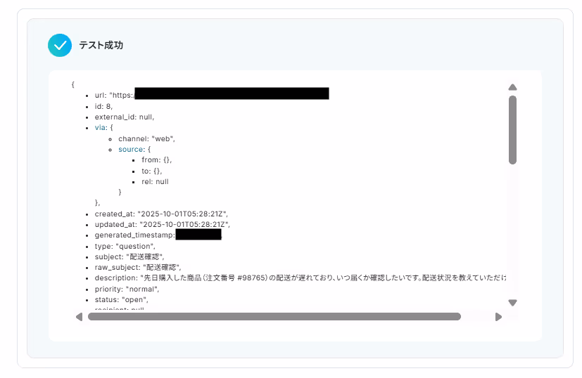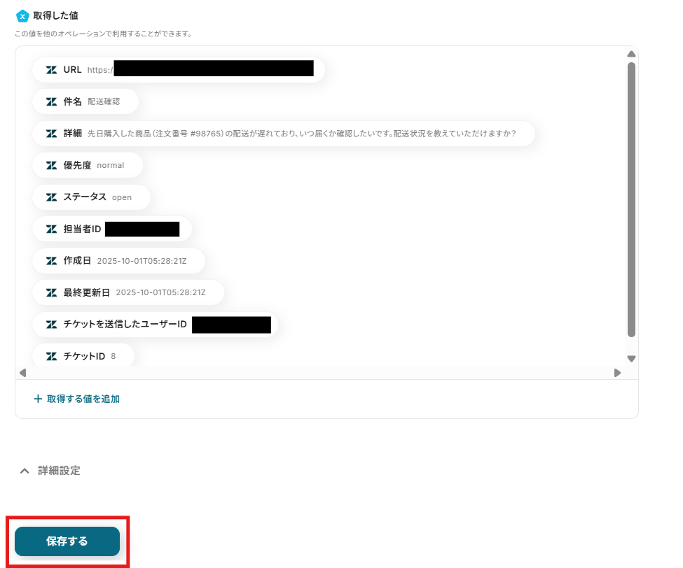 下部には取得した値が表示され、各項目の横に Zendeskで作成したチケットの詳細情報が表示されます。