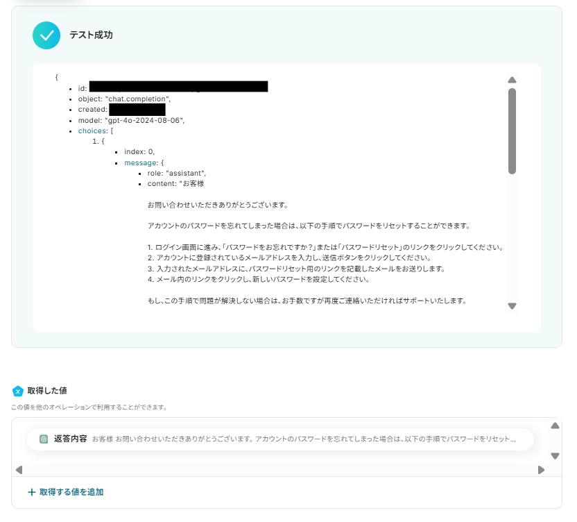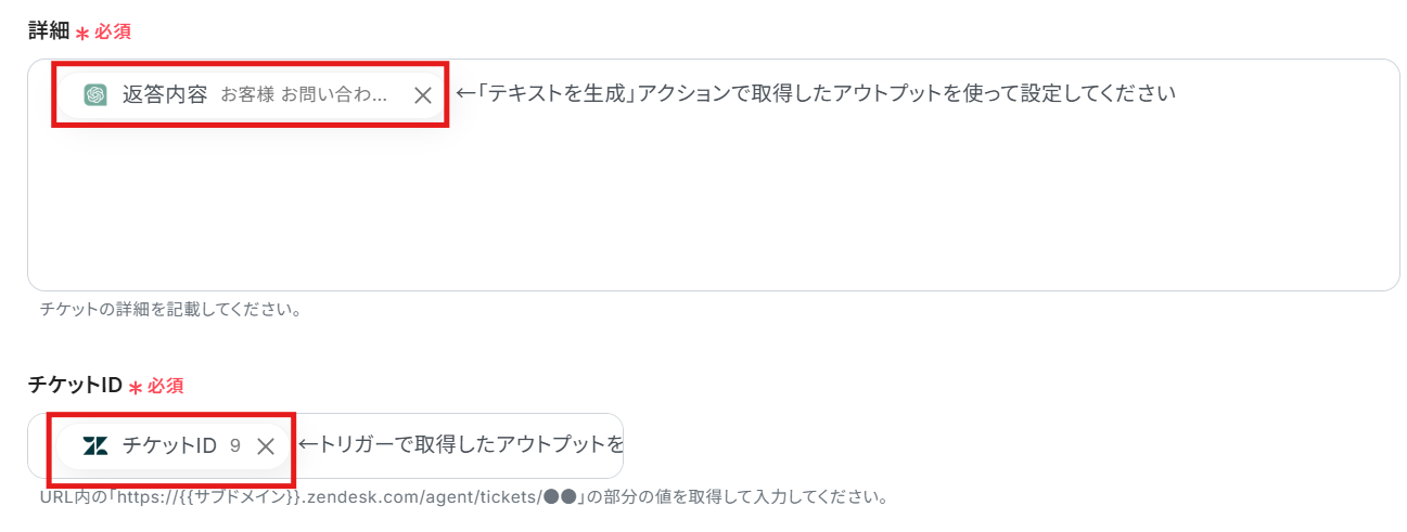 取得した値を使用することで、フローが起動するたびに、Zendeskから取得した情報が自動でChatGPTに反映されます!