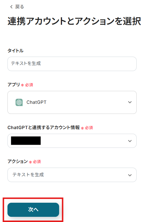 こちらもステップ1でマイアプリ連携したChatGPTのアカウント情報が自動で表示されます。