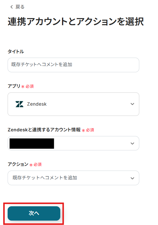 アカウント情報の項目にはステップ1でマイアプリ連携したZendeskのアカウント情報が自動で表示されます。