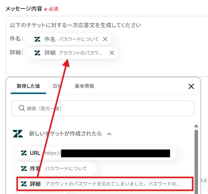 取得した値は編集欄をクリックし、「新しいチケットが作成されたら」から引用することができます。