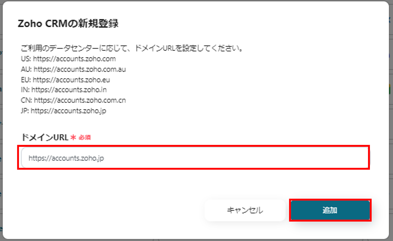 (2)Zoho CRMの新規登録画面で、ドメインURLを設定し追加をクリック