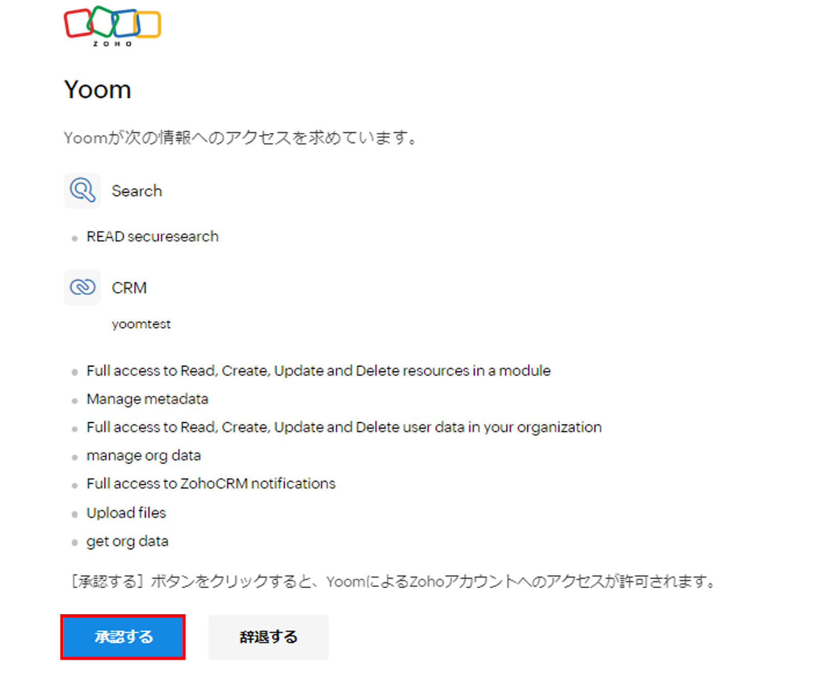 (3)Zoho CRMと連携するアカウント情報が正しいかを確認