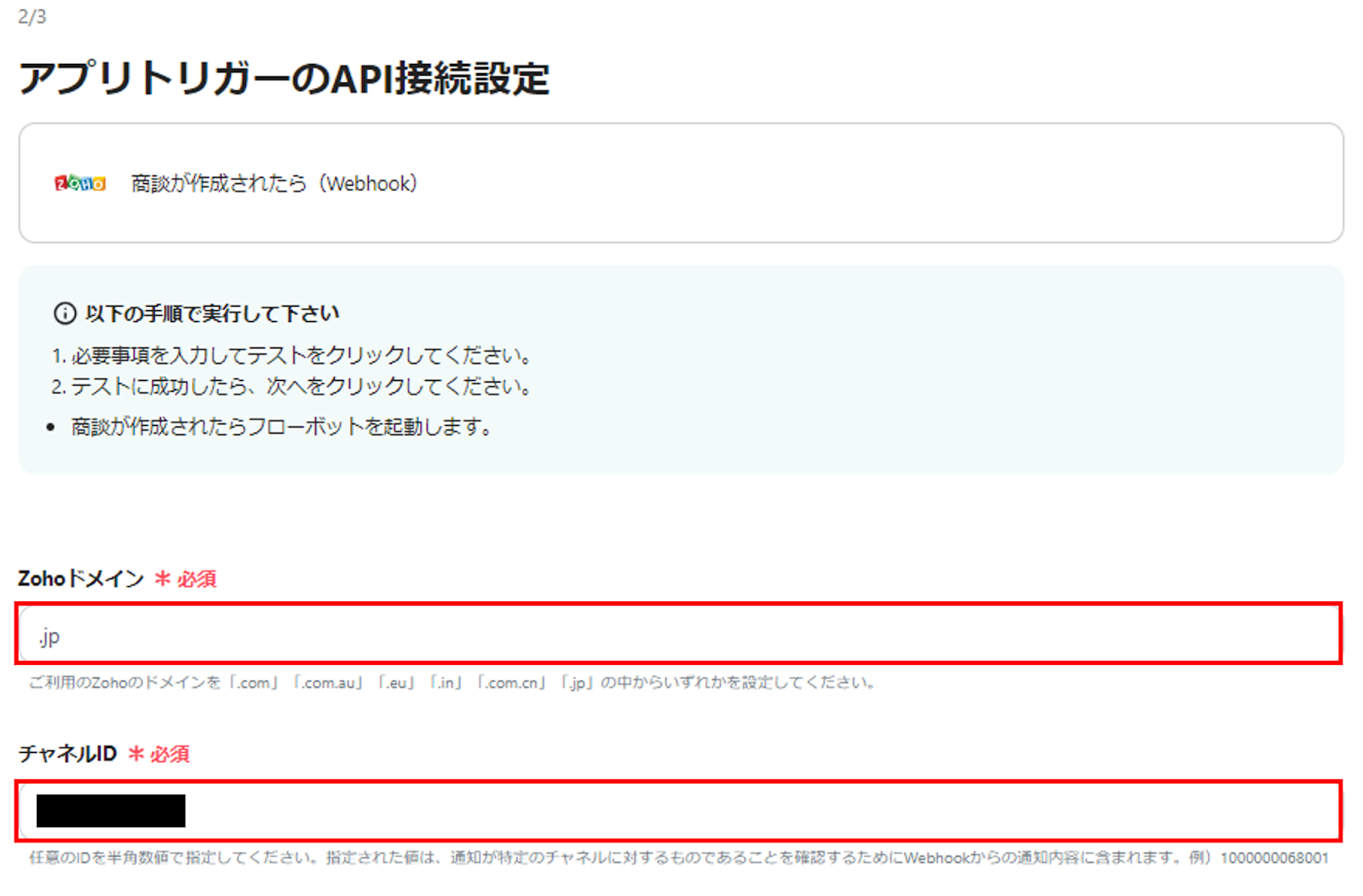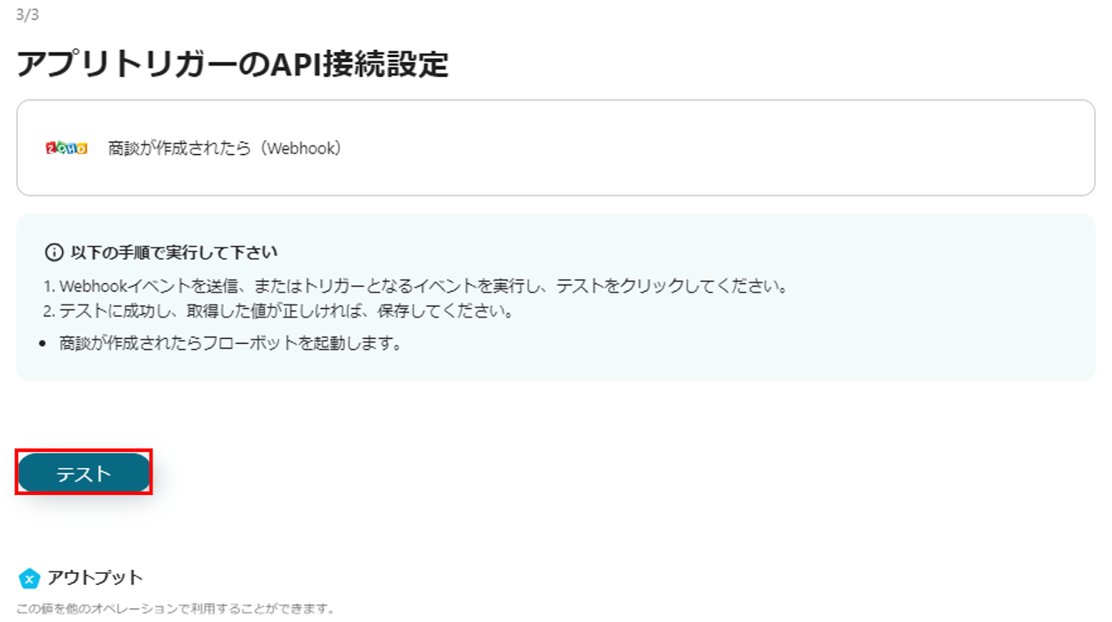 (9)商談を作成後にYoomの設定画面に戻り、テストをクリック