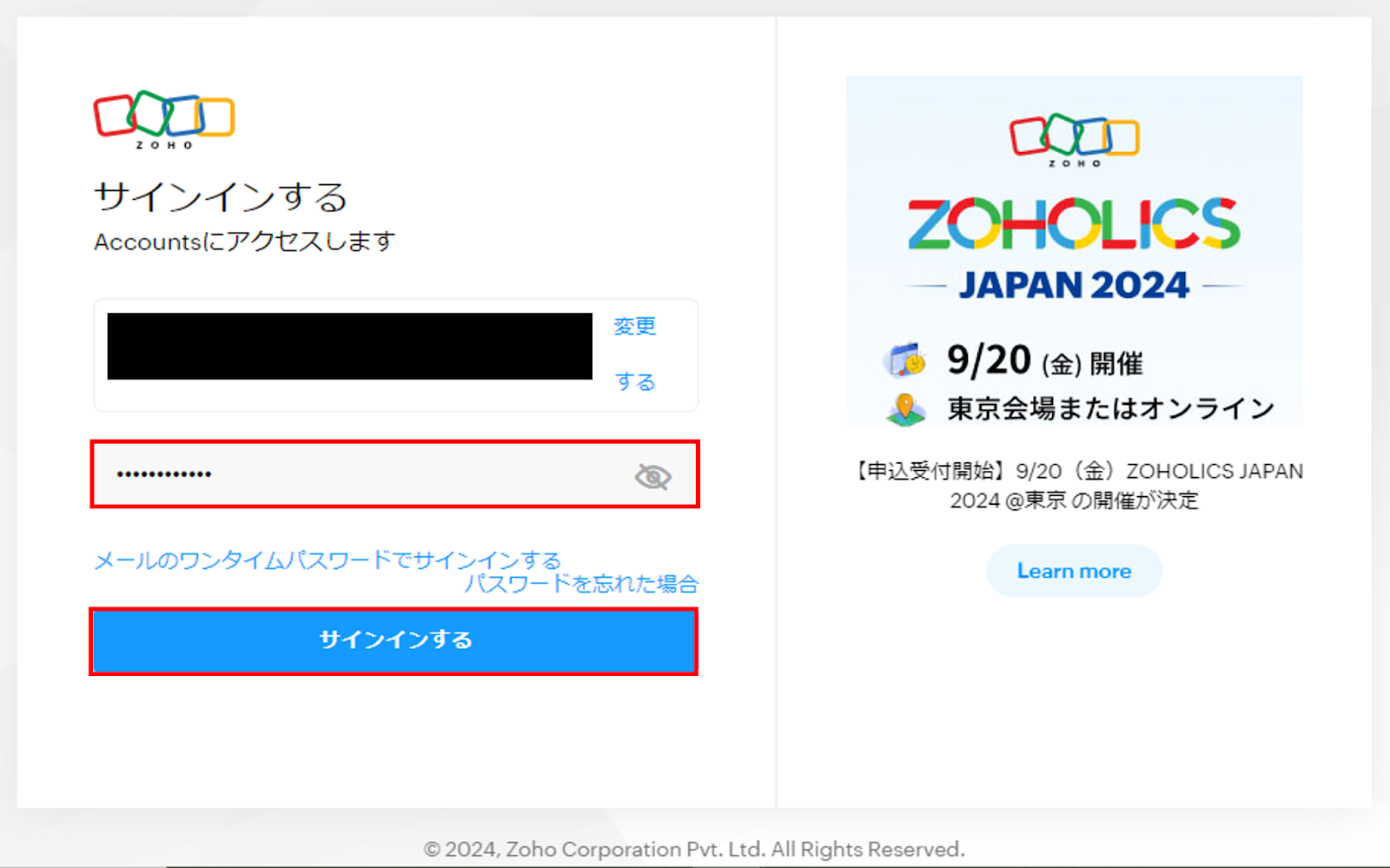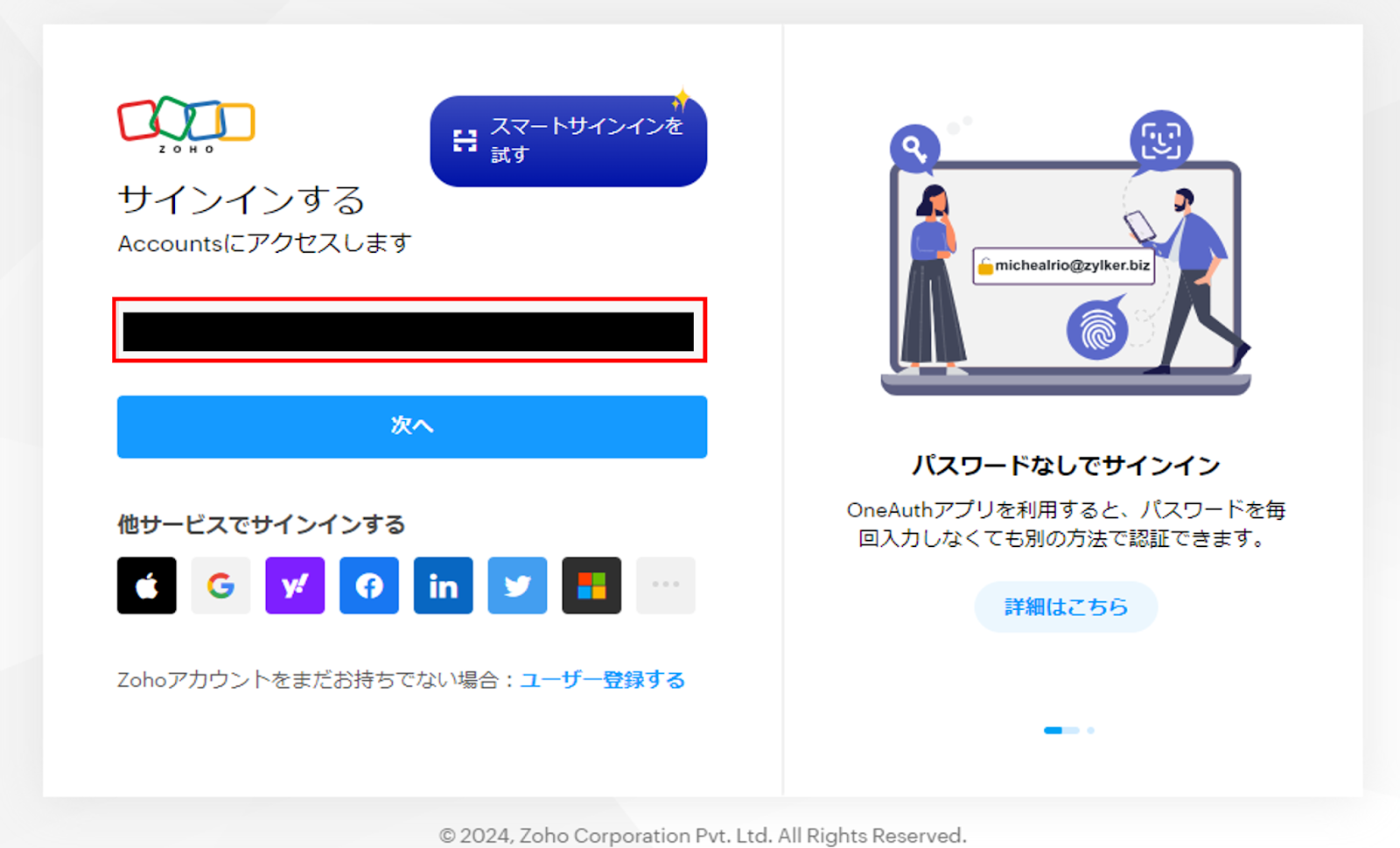 (3)サインイン画面にZohoアカウント情報を入力し、次へをクリック