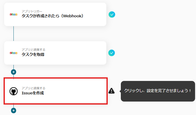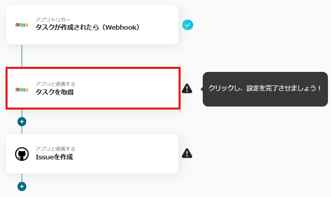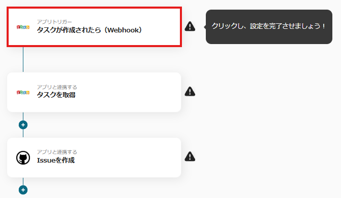 まずは、アプリトリガー「タスクが作成されたら(Webhook)」をクリックしましょう。
