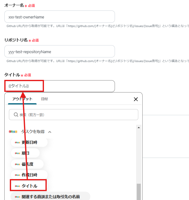 「オーナー名」「リポジトリ名」「タイトル」は必須項目なので、必ず入力しましょう。