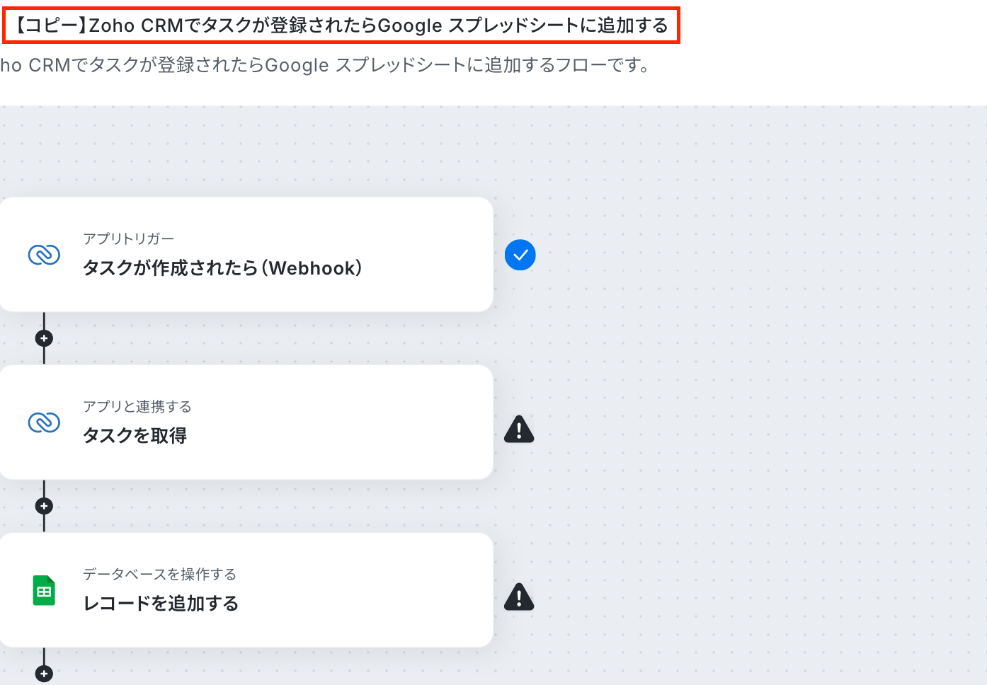 Zoho CRMでタスクが登録されたらGoogle スプレッドシートに追加するフローです。