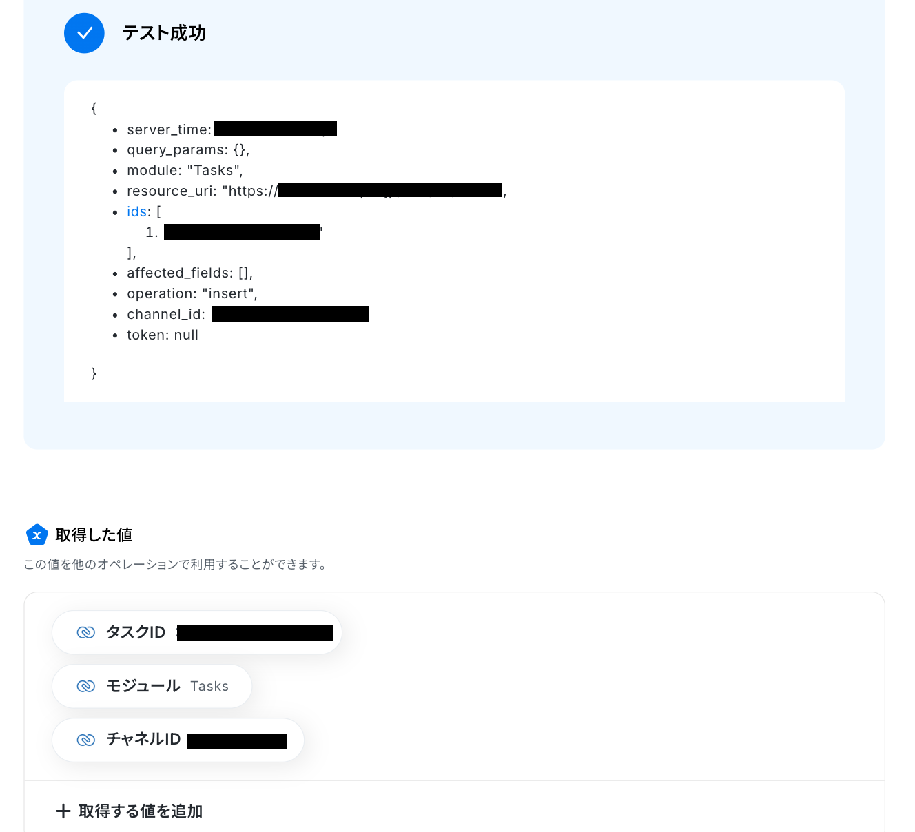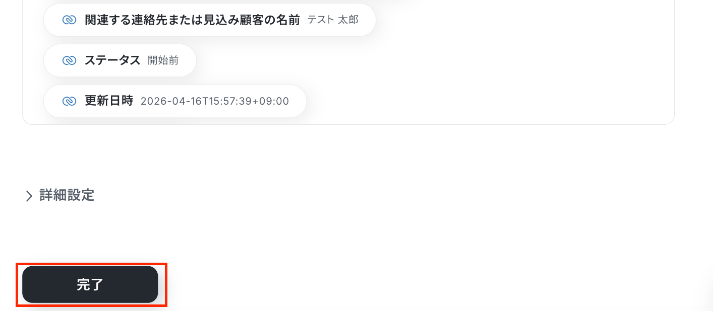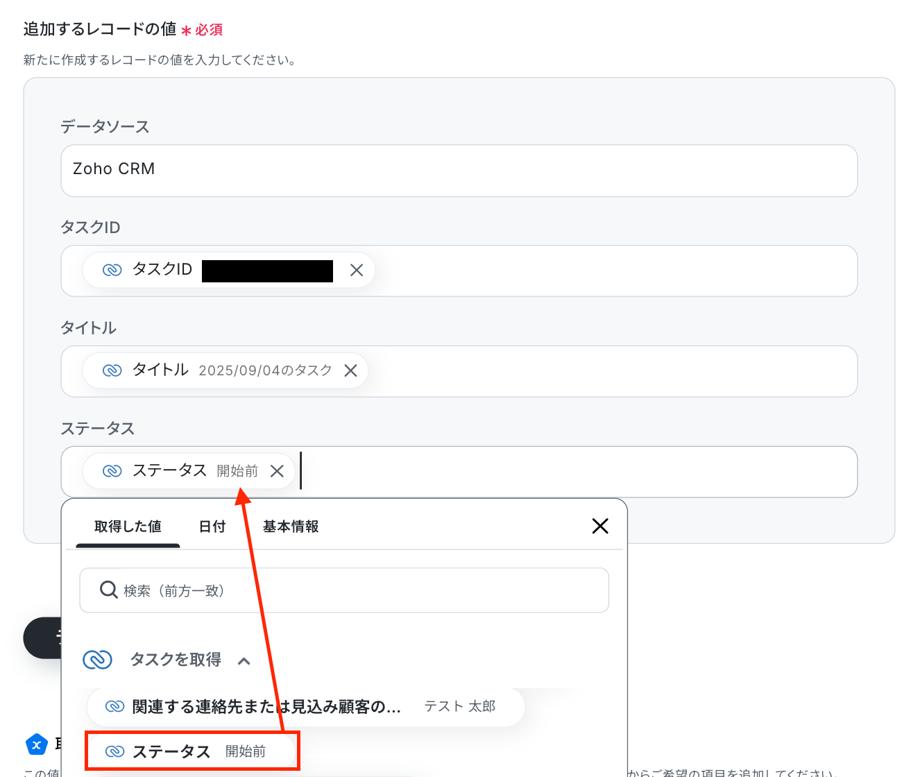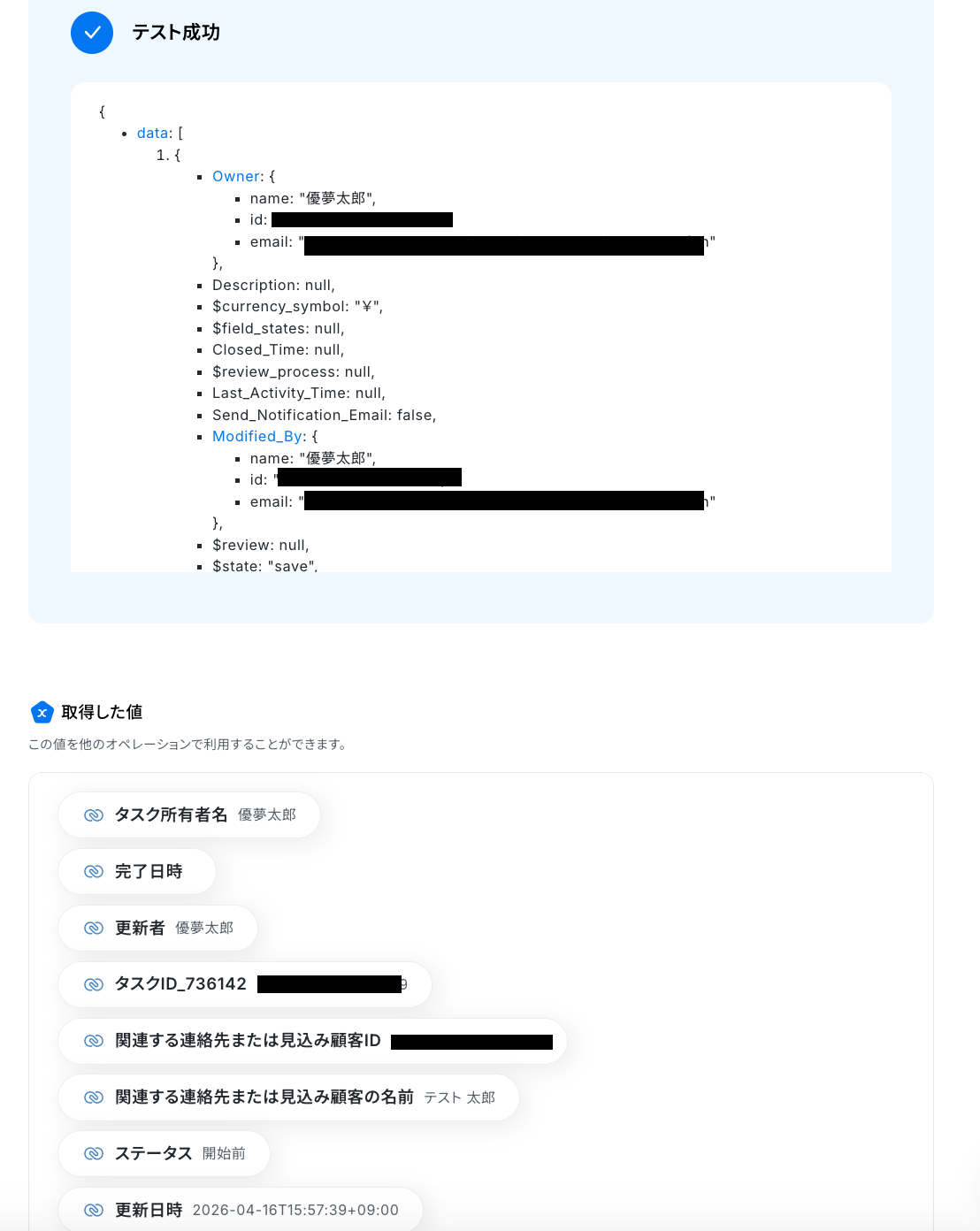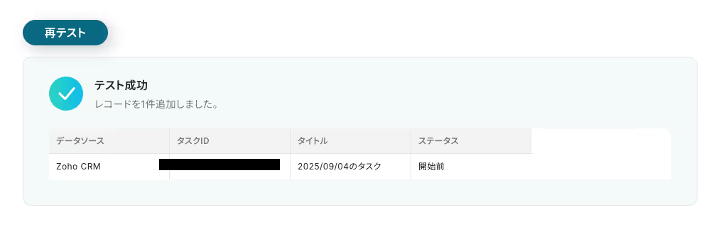 7. 下記の画面に移行するため、Zoho CRMでタスクを作成した後、「テスト」をクリックします。