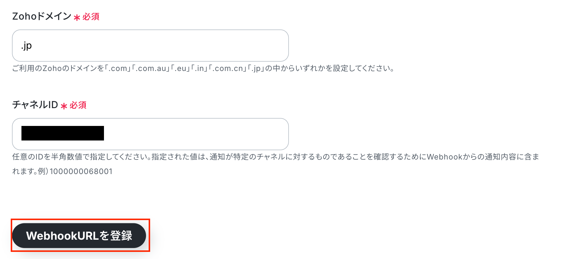 4. 注釈に沿ってZohoドメイン、チャネルIDを入力してください。