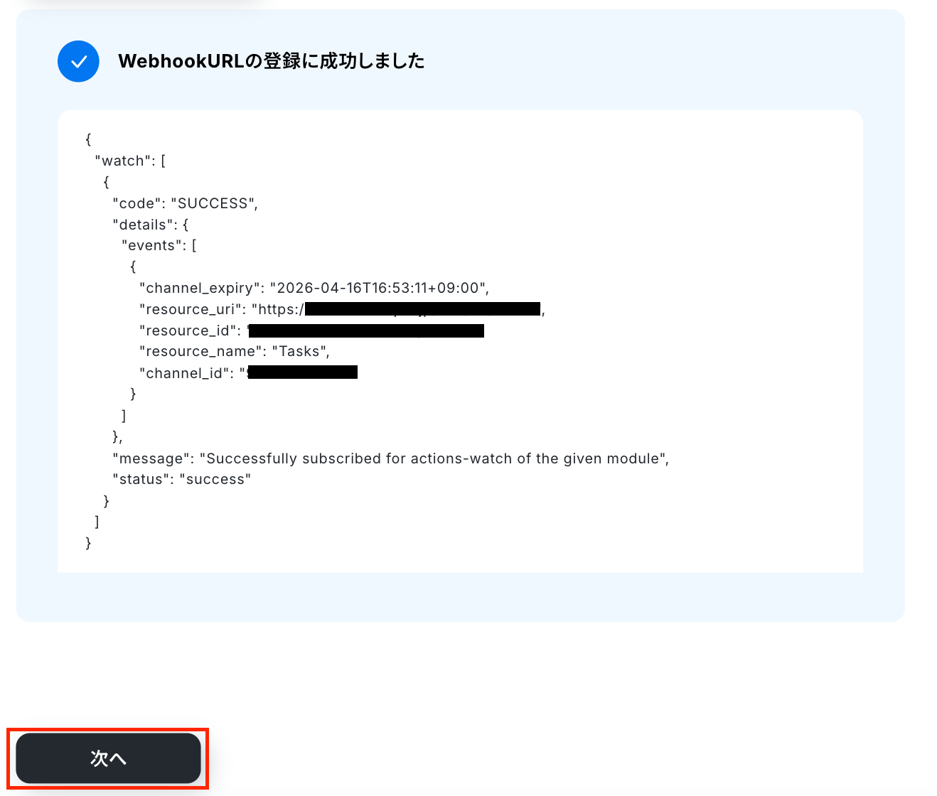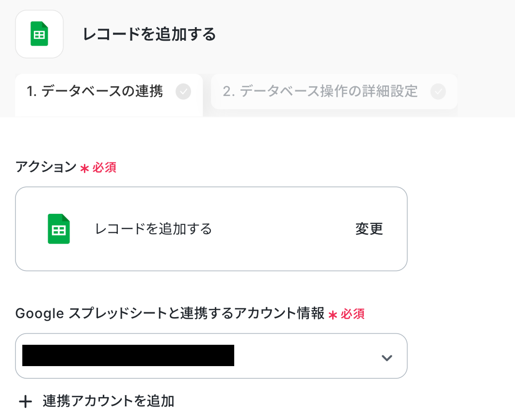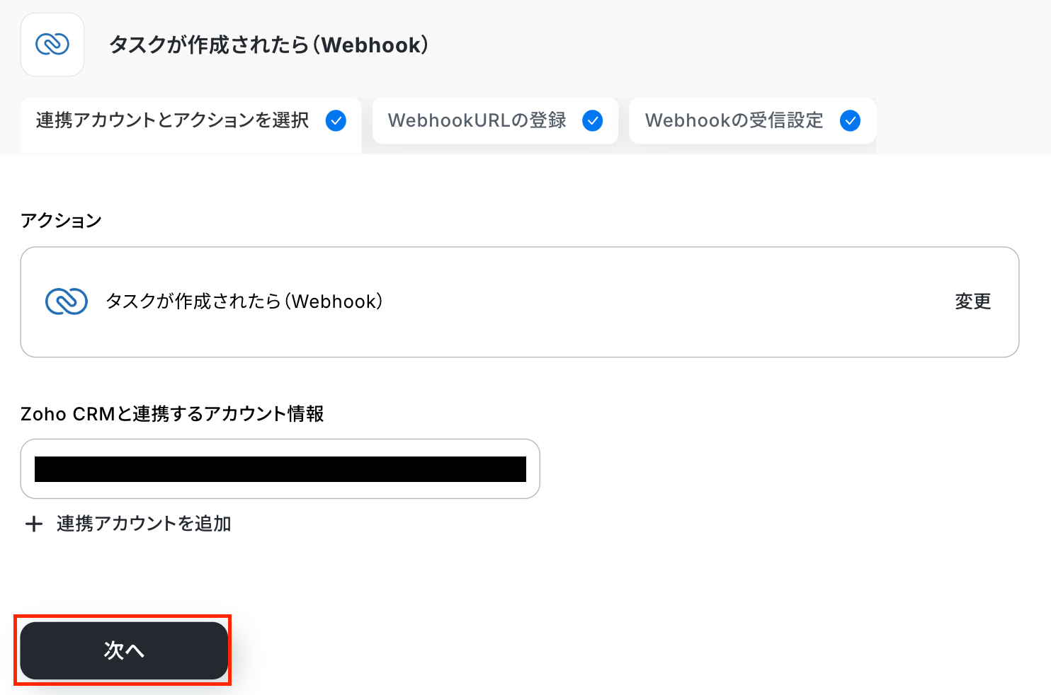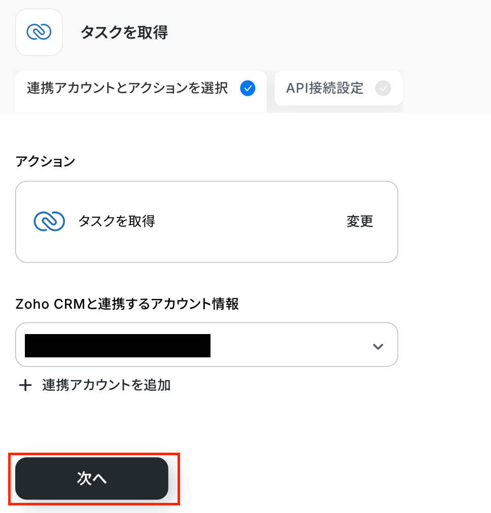 3. 連携アカウントとアクションを選択し、「次へ」をクリックしてください。