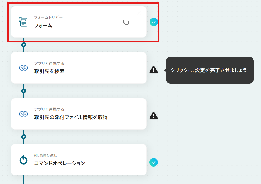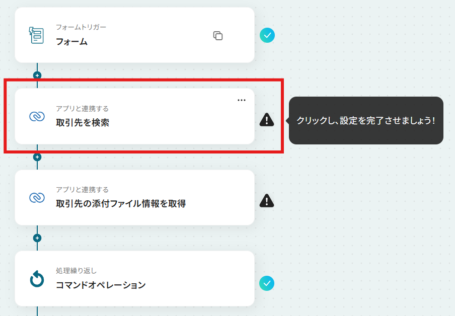 - オペレーションで、Zoho CRMの「取引先を検索」アクションを設定し、フォームで受け取った情報をもとに取引先を特定します
