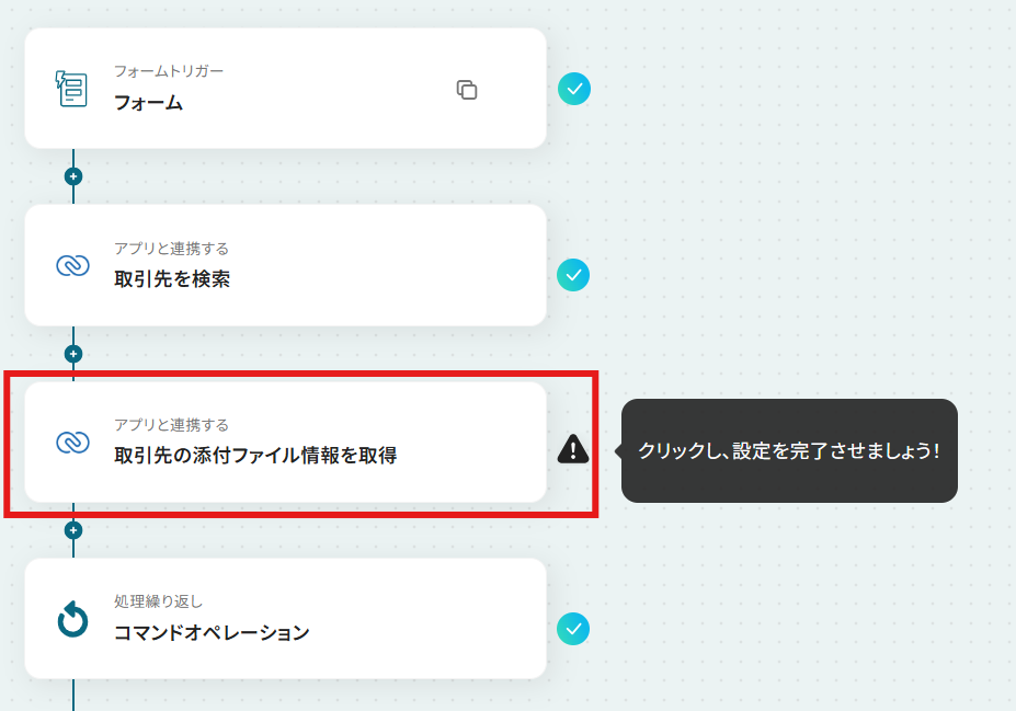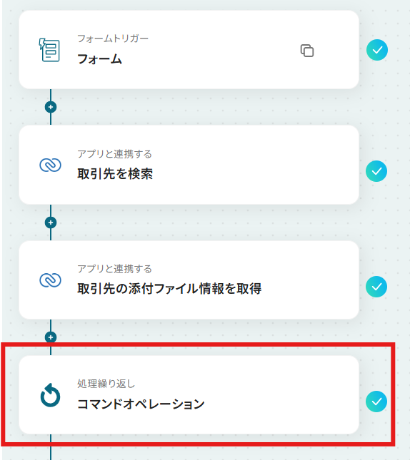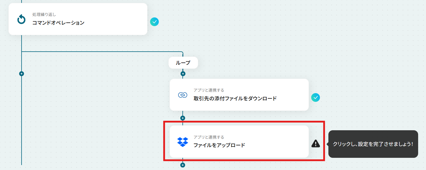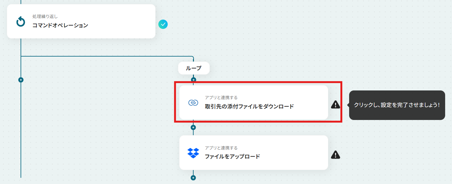- 次に、ループ機能を用いて、取得した添付ファイルごとの繰り返し処理を設定します
