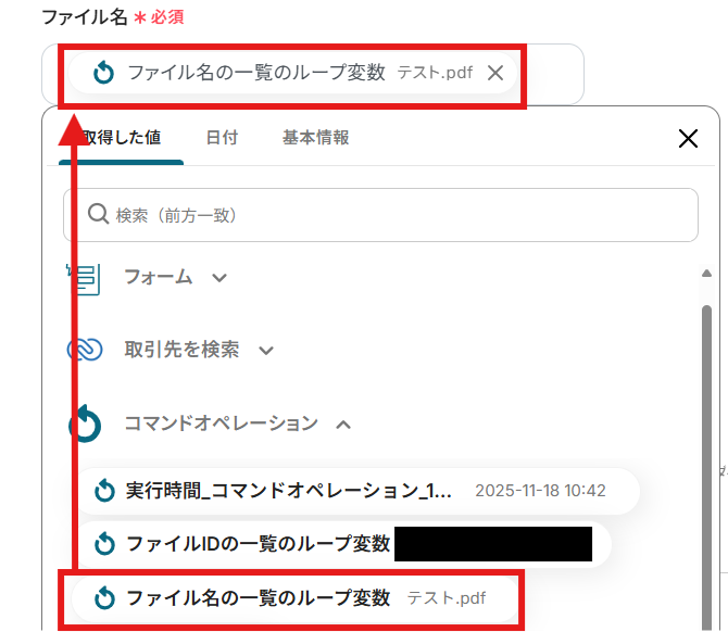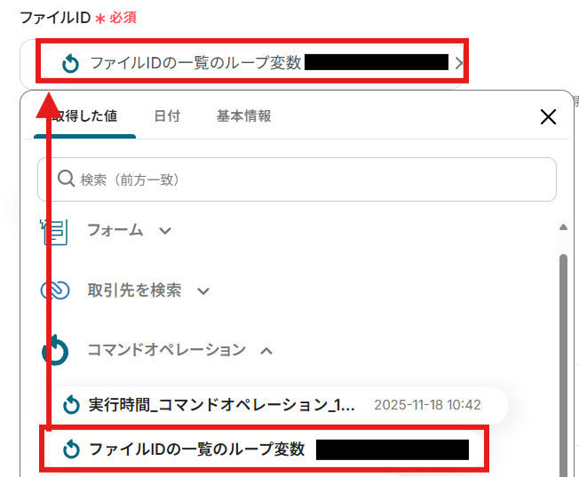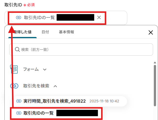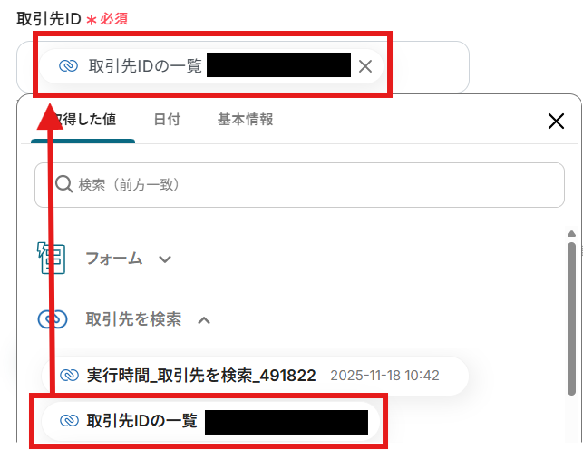 「取引先ID」に「取得した値」の「取引先IDの一覧」を設定しましょう。