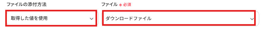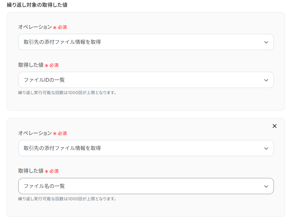 - ループ処理を設定する際、前段のオペレーションで取得した添付ファイルの情報の中から、繰り返し処理の対象としたいデータを任意で設定してください