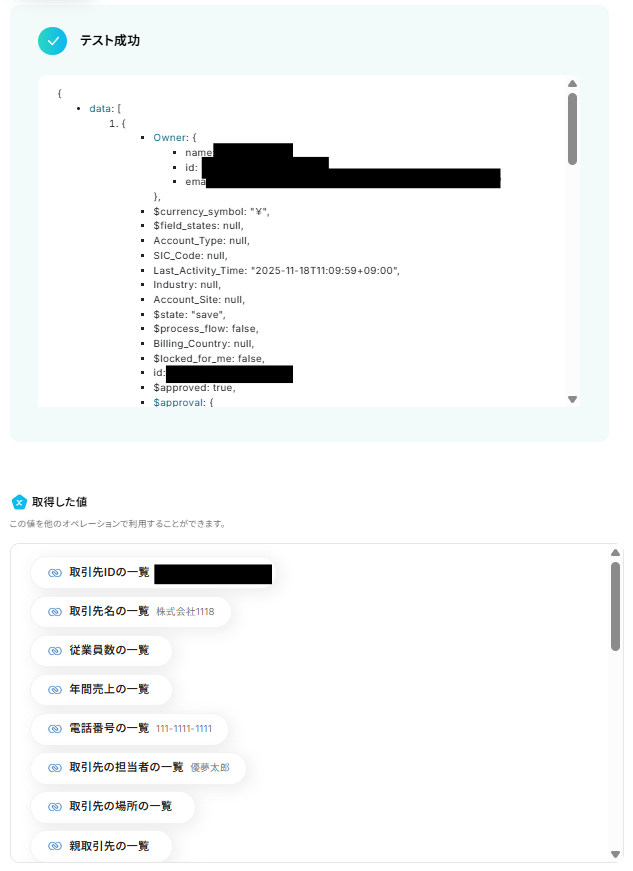 - Zoho CRMの「取引先情報を取得」アクションでは、トリガーで取得した取引先IDなどを使用して、特定の取引先情報を取得するように設定してください。