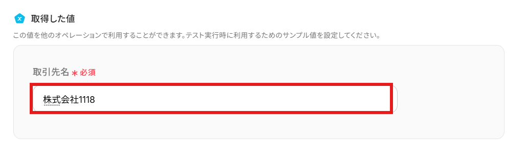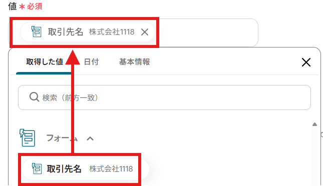 「値」に「取得した値」の「取引先名」を設定しましょう。