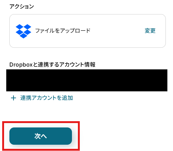 - 最後に、Dropboxの「ファイルをアップロード」アクションを設定し、ダウンロードしたファイルを指定のフォルダに保存します