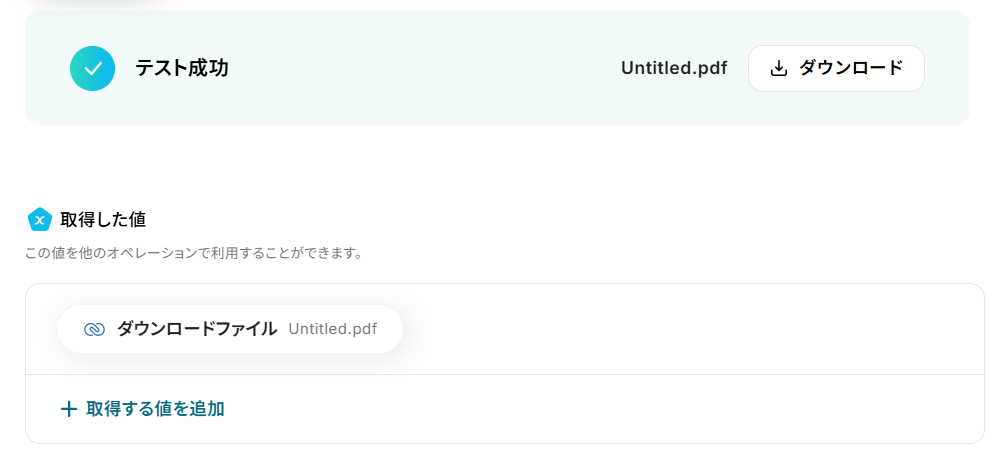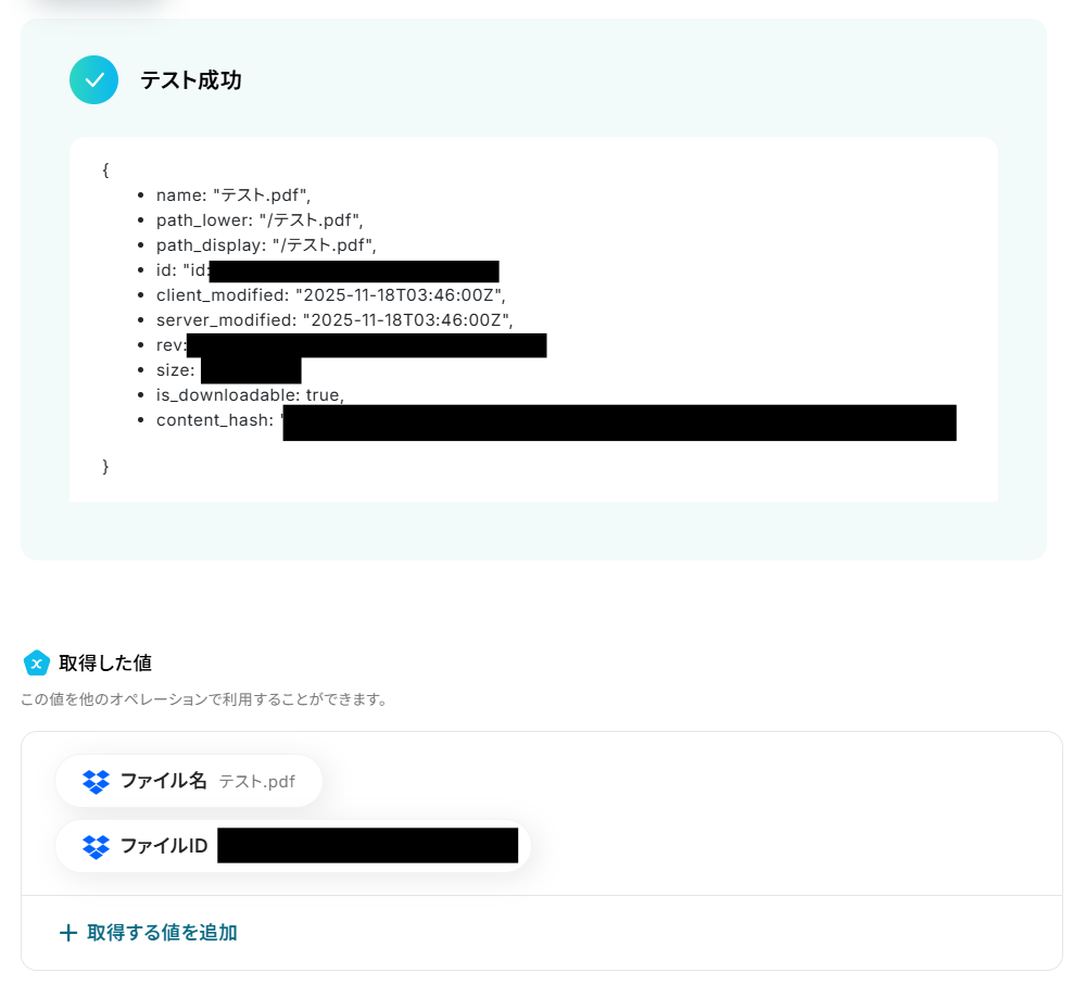 テストに成功すると「取得した値」に反映されます。詳しくは以下をご覧ください。
