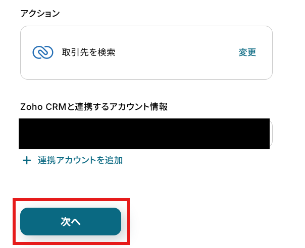 「Zohoと連携するアカウント情報」を確認し、「次へ」をクリックして進んでください。